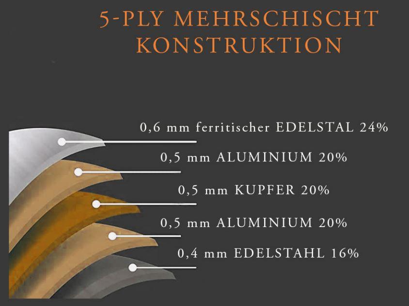 Falk Flandria Premium Kochgeschirr ist aus hochwertigem Mehrschicht-Material hergestellt. Das Falk Flandria Premium Kochgeschirr verfügt über eine 2,5 mm dicke Materialstärke, die aus 5 Schichten besteht: